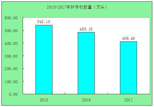 每年我國驢的數量都在減少,原因在于我國對于驢的需求非常大,驢的各個部位都有很大是市場空間,但是養殖和繁育驢的速度跟不上消費驢的速度,導致年年驢的數量減少,到2017年我國驢的存欄數量只有409萬頭。