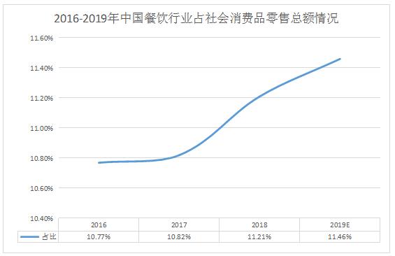 圖表:2016-2019年中國餐飲行業占社會消費品零售總額情況