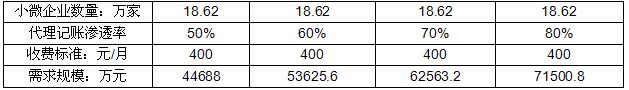 代理記賬需求的主要客戶是小微型企業,根據天津市第三次經濟普查數據顯示:天津市小微企業法人單位數量達18.62萬家,占全部企業法人單位的94.8%;假設按照80%的小微型企業有代理記賬需求,按照每個月400元的價格計算,天津地區每年的代理記賬的需求規模超過7億元;即使按照50%的小微型企業有代理記賬需求測算,天津地區的代理記賬的需求規模也高達44688萬元。