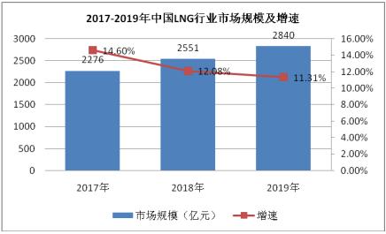 圖表:2017-2019年中國LNG行業市場規模及增速情況