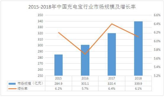 2018年,中國充電寶行業市場規模約為339.9億元,同比增長6.1%。2015-2018年,中國充電寶行業復合增長率約為6.0%。