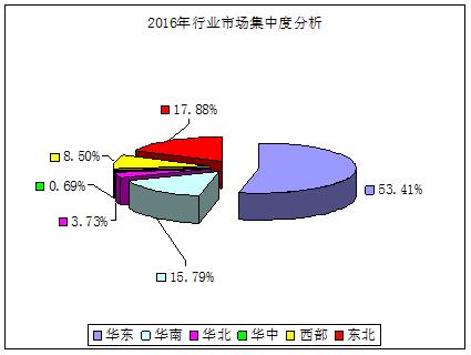 2016年國內瀝青行業主要集中在華東地區,占比為53.41%,其次是集中在東北地區,占比為17.88%,占比最少的是0.69%,在西部地區。