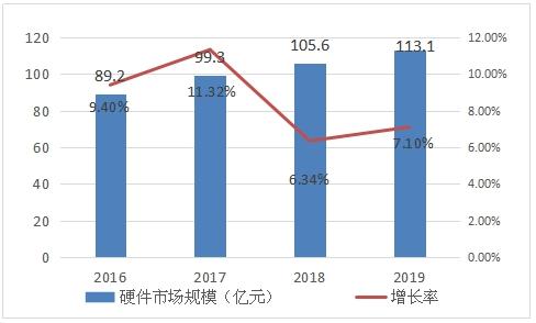 中國高校硬件設備市場規模持續增長,2017年市場規模達到137.8億元,增長率達12.58%,2018年市場規模擴大到154.5億元,增長率12.12%;2019年,市場規模達到172.4億元。
