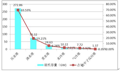 輕水堆和重水堆是在全球核電市場競爭中僅存的商業化堆型。截止2018年3月兩種堆型數量占比達93%。在各核反應堆堆型中,只有輕水堆和重水堆兩種堆型在全球核電市場競爭中生存下來。
