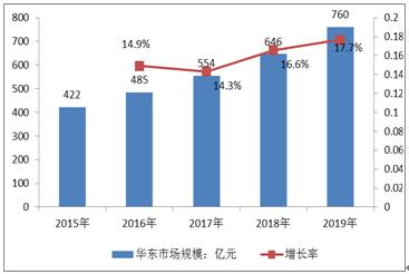 2019年華東地區市場規模為760億元,同比增長大約17.7%。2018年華東地區市場規模為646億元。