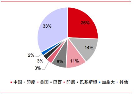 玉米、小麥、大米等谷物是主要使用化肥的農作物。從使用結構看,化肥在小麥、大米、玉米等谷物中的使用占比最高,其中玉米占比16.2%,居于首位。小麥、大米分別占比15.3%、13.7%,三種主要農作物的化肥使用占比合計為45.2%。從區域結構看,中國、印度、美國、巴西四大農業生產國是全球化肥的主要使用國家,使用占比分別為26%、14%、11%、8%,合計占全球化肥使用量的59%。