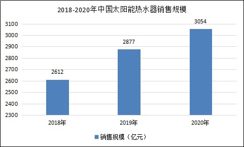 據數據顯示,2018年中國太陽能熱水器銷售規模為2612億元,2019年中國太陽能熱水器銷售規模為2877億元,2020年中國太陽能熱水器銷售規模為3054億元。