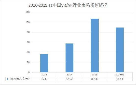 2019年上半年,中國VR/AR行業市場規模約為89.53億元,較2018年同期上漲了50.72%。近年來,整個行業保持著較高的增長速度。