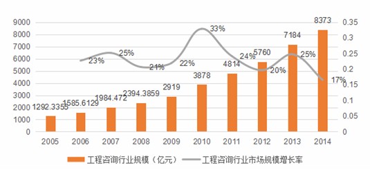據悉,2005年-2014年,我國工程咨詢行業營業收入從2005年的1292億元增加至2014年的8372億元,年復合增長率為19.5%。截至2014年底,我國有工程勘察設計機構19262家,比2005年增加了5017家;工程監理機構7279家,比2005年增加了1352家;工程招標代理機構5950家,比2008年增加了989家。