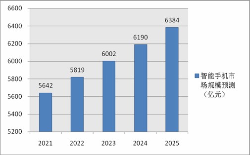 圖表:2021-2025年我國智能手機行業(yè)市場規(guī)模預(yù)測(單位:億元)