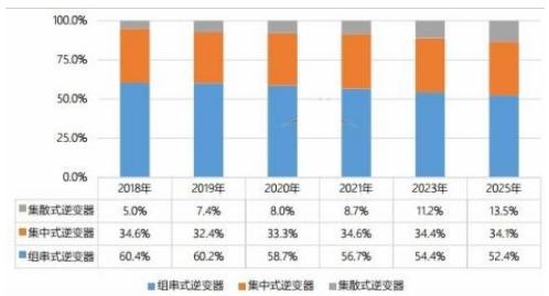 隨著分布式光伏市場的快速增大及集中式光伏電站中組串式逆變器占比的增高,組串式逆變器在2018年的市場占比達到了60.4%。集散式光伏逆變器相比集中式逆變器提升MPPT控制效果,且相比組串式逆變解決方案擁有較低的建造成本。因此,市場份額呈現(xiàn)出逐年上升的趨勢。2018-2025年不同類型逆變器的市場份額如下圖所示。