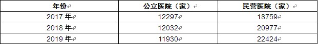 2019年醫療衛生機構中醫院3.4萬個,在醫院中有公立醫院1.2萬個,民營醫院2.2萬個。