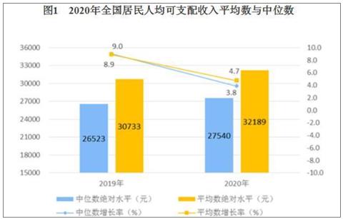 圖表:2020年全國居民人均可支配收入平均數與中位數