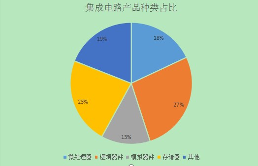 集成電路按照產(chǎn)品種類(lèi)又主要分為四大類(lèi):微處理器(約占18%),存儲(chǔ)器(約占23%),邏輯器件(約占27%),模擬器件(約占13%)。