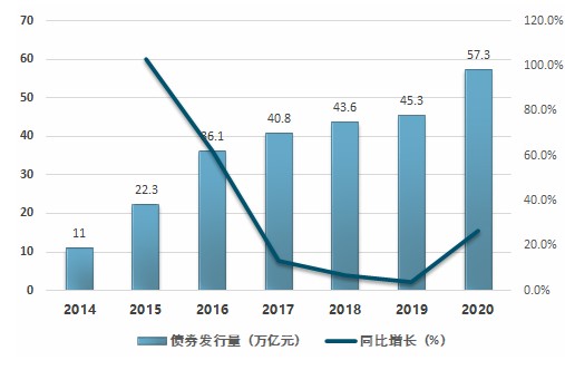 圖表:2014-2020年債券市場發(fā)行量趨勢圖(單位:萬億元)