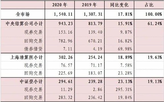 2020年,中央結(jié)算公司債券結(jié)算量943.23萬億元,同比增長15.91%。其中,現(xiàn)券153.16萬億元,同比增長9.87%;回購782.96萬億元,同比增長16.82%。