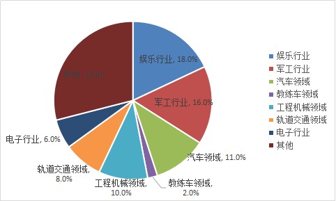 電缸行業(yè)主要應(yīng)用在娛樂行業(yè)、軍工行業(yè)、汽車領(lǐng)域、工程機械領(lǐng)域等,在其他領(lǐng)域還有廣泛的應(yīng)用,娛樂行業(yè)占比達18%,軍工行業(yè)占比16%,汽車行業(yè)領(lǐng)域(含教練車領(lǐng)域)占比共13%。