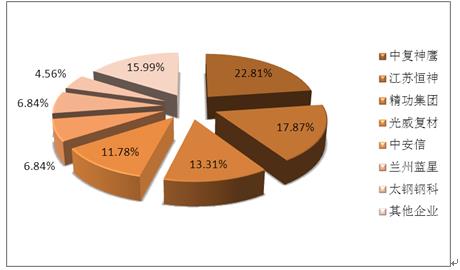 目前中國航空復合材料領域,中航工業旗下三家企業可以為各類飛機提供復合材料,占據國內航空復合材料工業重要地位。然而隨著航空復合材料的不斷發展,碳纖維復合材料的應用比例在未來將會越來越大。目前碳纖維材料主要生產企業及市場占比如下: