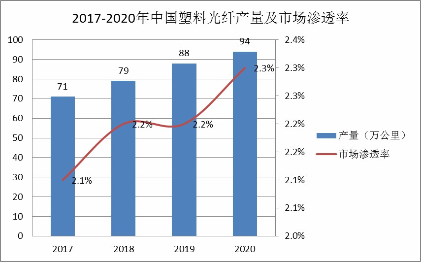 圖表:2017-2020年中國塑料光纖產(chǎn)量及市場滲透率