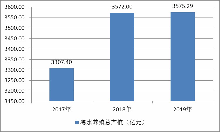 2019年漁業產值中,海洋捕撈產值2116.02億元,海水養殖產值3575.29億元,淡水捕撈產值398.09億元,淡水養殖產值6186.60億元。2019年,我國海水養殖產量為2065.33萬噸,同比增長1.68%;海水養殖產量占水產品總產量比重約32%。2019年,海水養殖產量分品種來看,貝類產品的養殖產量最多,為1438.53萬噸,占比海水養殖產量的70%;其次是藻類產品,產量為253.84萬噸,占比12%。2018年海水養殖產值為3572億元,2017年為3307.4億元。