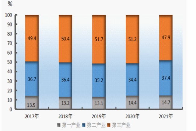 圖表:2017-2021年三次產(chǎn)業(yè)增加值占地區(qū)生產(chǎn)總值比重