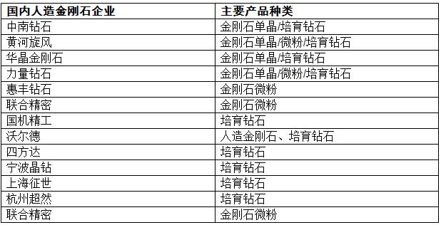 目前,國內的人造金剛石企業主要有:中南鉆石、黃河旋風、華晶金剛石、力量鉆石、惠豐鉆石、聯合精密等。其產品種類主要有:金剛石單晶、金剛石微粉、培育鉆石等。