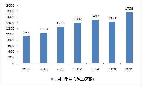 中國汽車流通協會二手車數據顯示,2021年全國二手車交易量為1758.51萬輛,較2020年同期增長22.62%,2020年同期受到疫情影響,全國二手車交易量為1434萬輛,參考2019年同期數據,二手車交易量較2019年同期增長了17.84%。