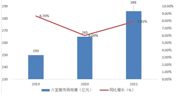 2021年八寶粥行業市場規模約為286億元,年增幅在6%左右。