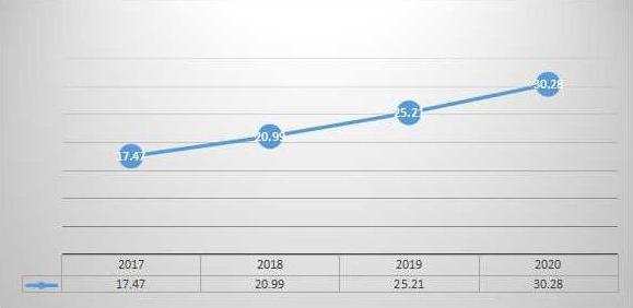 圖表:2017-2020年中國多式聯運貨運量(單位:億噸)