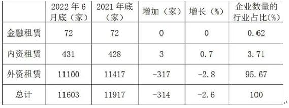 外資租賃行業進入2022年,一些外資租賃企業繼續退出市場。截至6月底,全國外資企業總數約為11100家,比上年底減少317家。