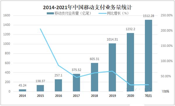 雖然我國移動支付產業起步較晚,但移動支付方式的創新速度及普及程度已經走在世界前列,隨著以微信、支付寶為首的支付系統平臺對移動支付功能的深入探索和大力推廣,越來越多的人群開始接受和使用移動支付,2021年中國移動支付業務量達1512.28億筆,較2020年增加了280.08億筆,同比增長22.73%。