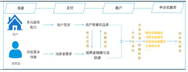 通過平臺生態化戰略提供多元化增值服務逐漸成為支付行業發展主流。平臺化模式 有別于傳統的服務傭金模式,在這種業務邏輯中,平臺通過多元化的增值服務來實現綜 合性收益,要同時滿足 C 端用戶和 B 端商戶的需求。對 C 端用戶來說,平臺需要開拓 更多的場景來滿足消費者需求,吸引流量,提高消費者規模和活躍度,以實現平臺的規 模經濟效應。對 B 端商戶來說,平臺要增強為商戶提供多元服務的能力,滿足商戶數字 化經營需求,優化商戶的服務品質。
