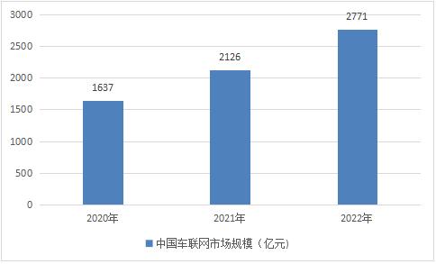 由于車聯網是5G在智能網聯汽車領域的主要應用場景、5G產業發展迅猛等影響,車聯網行業發展受到強大推動。近年來,中國車聯網市場規模保持高速增長,2017-2020年年均復合增長率達到29.95%。至2022年增長至2771億元。