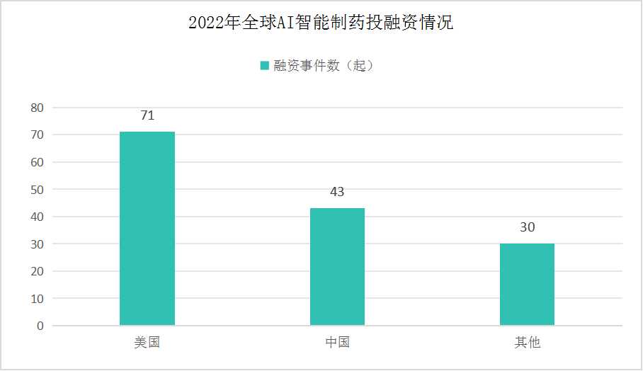 根據智藥局的不完全統計,2022年全球AI+藥物研發相關融資活動異常活躍,總融資事件達144起,總金額為62.02億美元,相較于2021年呈現雙雙上漲的態勢。其中,美國的AI藥物研發融資事件最多,達到71起;中國緊隨其后,有43起;其他國家和地區為30起。這說明全球范圍內的投融資活動主要集中在美、中、歐等地區。