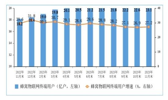 移動電話用戶數穩中有增,5G用戶規模加速擴大。截至11月末,3家運營商的移動電話用戶總數達17.26億戶,比上年末凈增4269萬戶。其中,5G移動電話用戶達7.71億戶,比上年末凈增21040萬戶,占移動電話用戶總數的44.7%,占比較上年末提高11.4個百分點。
