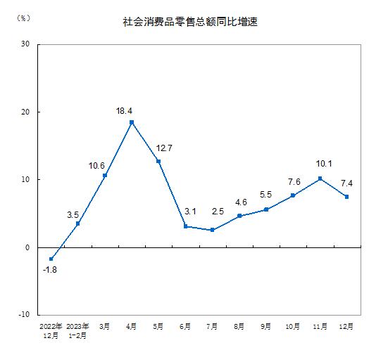 按經營單位所在地分,12月份,城鎮消費品零售額37071億元,同比增長7.2%;鄉村消費品零售額6479億元,增長8.9%。2023年,城鎮消費品零售額407490億元,比上年增長7.1%;鄉村消費品零售額64005億元,增長8.0%。