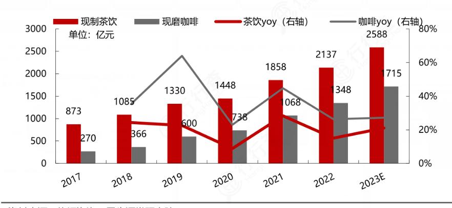 飲品店行業也呈現出蓬勃發展的態勢。隨著消費者需求的多樣化和個性化,飲品店行業提供了豐富的選擇。總體市場規模從2017年的人民幣1152億元增長至2022年的人民幣3054億元,預計到2023年將達到3748億元。其中,新式茶飲店和現制咖啡店是最常見的兩類飲品店。新式茶飲店行業已經歷了快速的發展和擴張,市場規模從2017年的668億元增長至2022年的2029億元, 2023年達到2535億元。