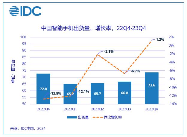 IDC報告顯示,2023年全年,中國智能手機市場出貨量約2.71億臺,同比下降5.0%,創近10年以來最低出貨量。不過2023年第4季度,中國智能手機市場出貨量約7363萬臺,同比增長1.2%, 在連續同比下降10個季度后首次實現反彈。
