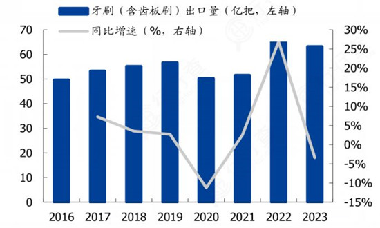 圖表:2016-2023年中國(guó)牙刷出口量及同比增速(億把,%)