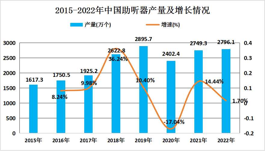 據(jù)中研普華產(chǎn)業(yè)研究院發(fā)布的《2024-2029年中國助聽器行業(yè)市場深度調研及投資策略預測報告》顯示,2021年我國助聽器產(chǎn)量達到了2749.3萬個,同比增長了14.44%。這一數(shù)字不僅展示了助聽器行業(yè)的強勁增長勢頭,也反映出市場需求的旺盛。到了2022年,盡管增速有所放緩,但助聽器產(chǎn)量仍然保持增長,達到了2796.1萬個,同比增長1.70%。