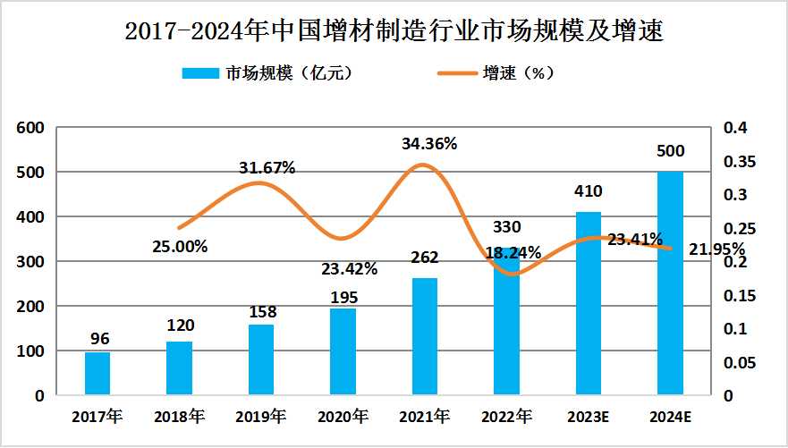 圖表:2017-2024年中國增材制造行業市場規模及增速