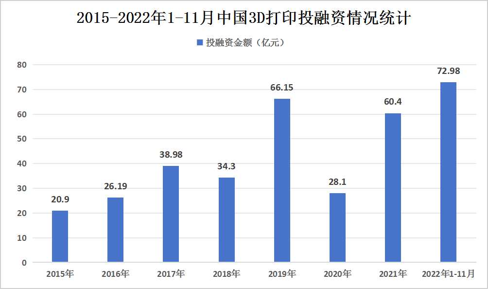 如今,隨著技術的不斷進步和市場的日益成熟,中國增材制造行業已經取得了顯著的成就。市場呈現出快速增長的趨勢,吸引了越來越多的投資者關注。2021年,我國3D打印市場共發生了46起投融資事件,投融資金額達到了60.4億元。而到了2022年的前11個月,這一數字更是有所攀升,共發生了35起投融資事件,投融資金額完成72.98億元。
