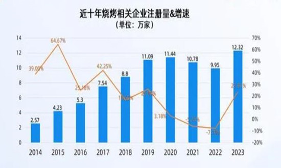 企查查數(shù)據(jù)顯示,國內(nèi)現(xiàn)存燒烤相關(guān)企業(yè)55.07萬家。近十年,其注冊(cè)量呈整體增長態(tài)勢(shì)。借淄博燒烤火熱出圈等流量,2023年注冊(cè)量達(dá)12.32萬家,同比增長23.81%,其中,淄博市注冊(cè)量同比增長29.53%至737家,超全國增速。