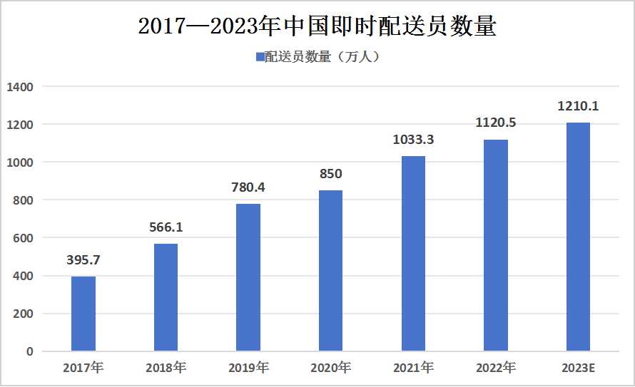 不僅如此,即時配送行業(yè)還通過高效對接供需雙方,為從業(yè)者帶來了相對穩(wěn)定的收入來源。隨著訂單數(shù)量的持續(xù)增長,即時配送員的隊伍也在不斷壯大。據(jù)統(tǒng)計數(shù)據(jù)顯示,從2017年至2022年,中國即時配送員的數(shù)量實現(xiàn)了跨越式增長,從395.7萬人迅速攀升至1120.5萬人,年復(fù)合增長率高達(dá)23.1%。這一數(shù)據(jù)不僅展現(xiàn)了即時配送行業(yè)的強勁發(fā)展勢頭,也凸顯了其在吸納就業(yè)方面的巨大潛力。