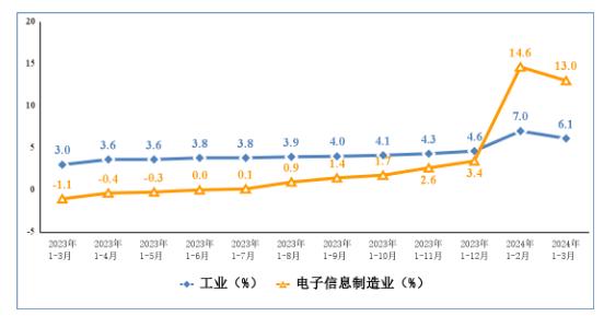 一季度,規模以上電子信息制造業增加值同比增長13%,增速分別比同期工業、高技術制造業高6.9個和5.5個百分點。3月份,規模以上電子信息制造業增加值同比增長10.6%。