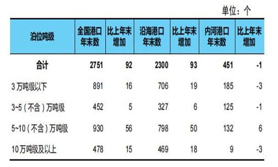 全國港口萬噸級及以上泊位2751個,比上年末增加92個。從分布結構看,沿海港口萬噸級及以上泊位2300個、增加93個,內河港口萬噸級及以上泊位451個、減少1個。