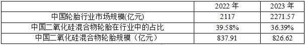 根據Research and Markets數據,2022年國內輪胎市場約為2117億人民幣,2023年為2271.57億人民幣。根據測算情況,我國二氧化硅混合物輪胎占比在行業中的占比約為39.58%和36.39%。據此測算,2022年和2023年,我國二氧化硅混合物輪胎規模分別為837.91億元和826.62億元。