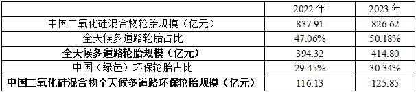 根據行業發展情況,結合橡膠工業協會專家訪談以及市場調研的結果,2023年我國二氧化硅混合物中,全天候多道路輪胎的市場占比約為50%左右。據此測算,2022年和2023年,我國二氧化硅混合物全天候多道路輪胎規模分別為394.32億元和414.80億元。