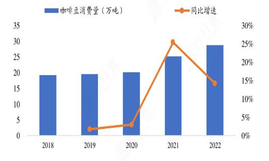 過去,咖啡曾是小眾精英熱衷的消費品,隨著咖啡產品滲透到大眾消費,功能性現磨咖啡的需求增長明顯,帶來消費者的高黏性。2022年現磨咖啡的行業規模為1348億元,且未來會保持21.2%的年復合增長率。快速增長的現磨咖啡市場帶動了其主要原材料精品咖啡豆市場的發展。根據USAD數據,2022年我國咖啡豆消費量達到28.8萬噸,同比增長14.3%。