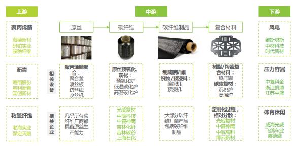碳纖維的產業鏈包含從一次能源到終端應用的完整制造過程,包含預氧化、炭化、預浸料等多個過程。碳纖維工藝復雜,涉及多種設備,生產條件要求嚴格,整個工藝流程中涉及技術參數控制點3000-5000個。從全產業鏈來看,中游是核心環節,技術、資金、設備、產品質量門檻高。